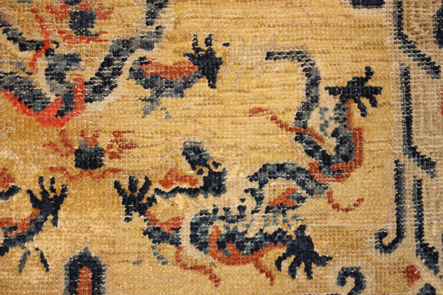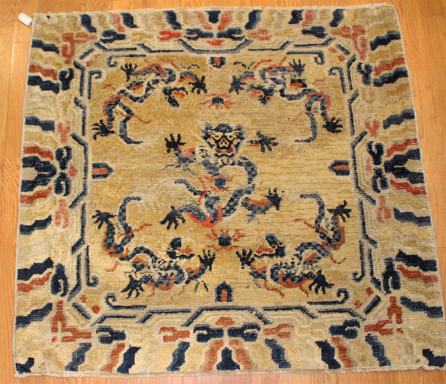 An Antique Chinese Mat with a bold dragon motif and bright blue and yellow colors