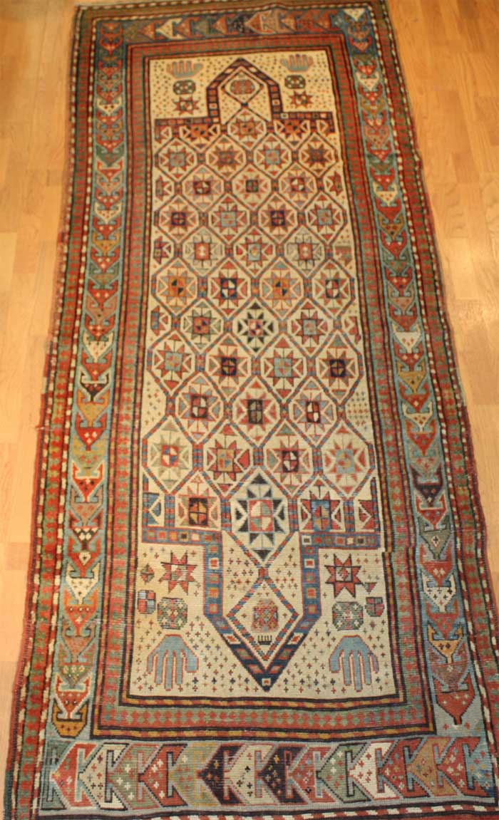 Antique Kazak Prayer Rug with an especially hypnotic border and gorgeous star pattern